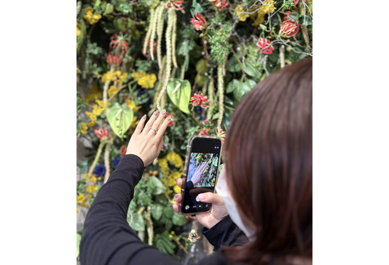 こちらは、世界も注目!華道家美榮さんデザインのフォトスポット。長崎の花屋といえば!の「オランダヤ」さんとタッグを組んで作っていただきました。テーマは「和華蘭」長崎らしいテーマですよね。室内でも新緑カラーを楽しみながら、指輪づくりをしていただけます。