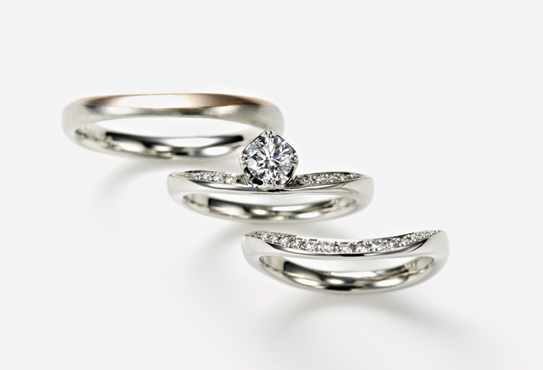 プラチナが繊細なブライダルジュエリーに使われる最大のポイントがあります。プラチナには“粘り強さ”“やわらかさ” という特性があります。たとえば、ホワイトゴールドの素材をカステラに例えると、プラチナはジェラート。デザインのしやすさはもちろんですが、年齢を重ねてリングのサイズが変わってもリサイズしやすいという特徴も。シルバーアクセサリーと同じように、もちろん純粋なプラチナだけではでは軟らかすぎるため、同じ白金属のパラジウム、ルテニウム、イリジウム等の金属を1%~15%含ませて硬度を出しています。