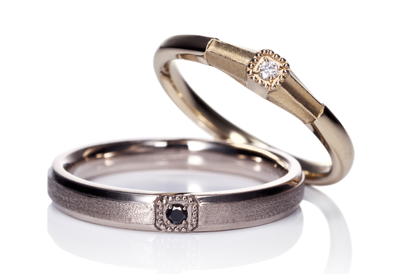 プラチナだけでなくゴールド素材や、ミル打ちなど巧みなセンスで彩られる結婚指輪たちはどれも見たことがない個性的なものばかり。でも普段使いがしやすい作りになっているため、一度見たら離れられないデザイン性が魅力です。