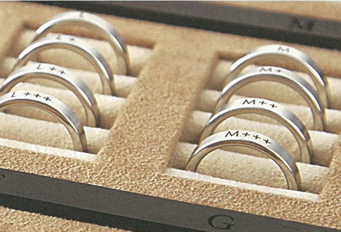 通常指輪のサイズは)1号刻み(#1、#2、#3)や0.5号刻みで(#1、#1.5、#2、#2.5)の様なサイズ設定ですがCOLANYは0.25号刻みで製作してくれますそして専用の測定ゲージまで用意されています。着け心地にこだわった結果サイズも重要な要素と捉え取り組んでいます。そしてベストな状態を常に保つ為に50年間サイズ直しを無料で行っています。購入後にメンテナンス費用がかからない事も嬉しいですね!