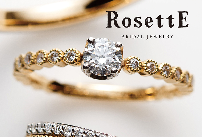 クラシカルで上品な大人っぽ印象のRosettE(ロゼット)の婚約指輪は海外でも人気な重厚感があるブランドです。プラチナはもちろん、ゴールド素材で展開しているデザインも多く、婚約指輪を普段もおしゃれに使いたいとうい花嫁さんからのお声が多くありました。セットリングが多いので今後、結婚指輪との重ね着けも楽しめる婚約指輪ブランドです。「彼からせっかくいただく婚約指輪をなるべく着けていたい」という花嫁さんも多く、ミルグレインや馴染みの良いおしゃれな婚約指輪デザインがプロポーズリングに人気の理由です。
