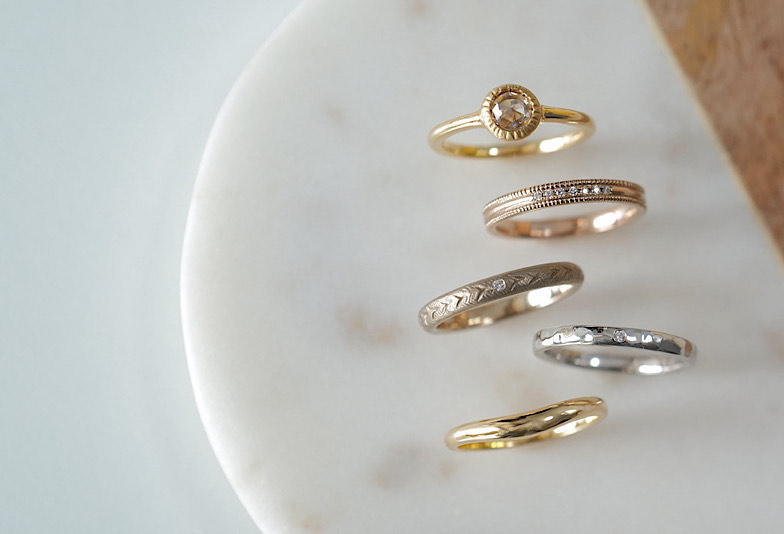 バーズは、「風のように軽やかに」というテーマ通り、手元に馴染みやすく、ストレスフリーな着け心地を追求して作られています。また、指輪はひとつひとつアトリエで原型から作られており、表面のテクスチャーは職人による手作業で彫られているため、柔らかな風合いと温かみが生まれるのが特徴です。素材は4種類の中から、ふたりの好みの色・肌馴染み・ライフスタイルに合ったものを選ぶことが出来ます。指輪には、「自由な空を羽ばたくふたりの幸せな未来」というふたりの美しい想いを形にしており、意味合いやふたりの個性を重視する方に支持されているブランドです。