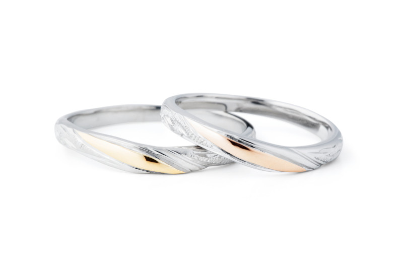 コナは、ハワイ語で「南風」を意味し、南から吹く穏やかな風が「新しい生活の始まり」や「幸せを運んでくれる」といったロマンチックで縁起の良い意味合いを持っています。結婚という新たな門出にふさわしいモチーフの結婚指輪です。スクロール(波)の彫り模様が施された動きのあるウェーブラインの指輪に、中央のゴールドのコンビネーションが爽やかな印象を与えてくれるデザインです。