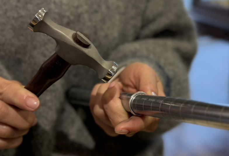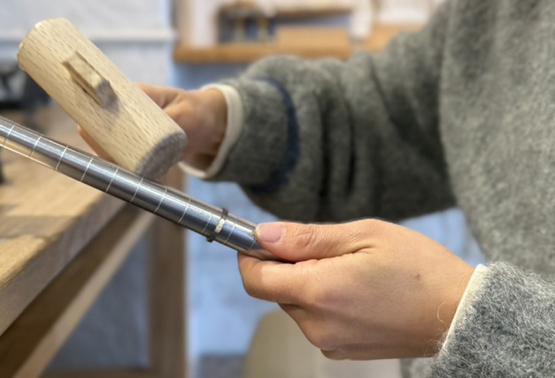リング状にしていただいた金属を、リングサイズ棒に入れて指輪のサイズに調整します。予定サイズより若干小さめに調整するのがポイントです。
