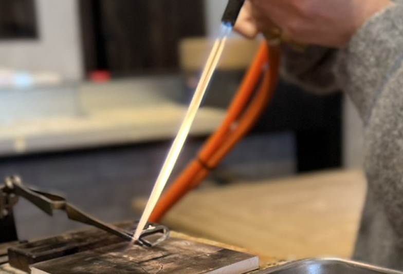 金属の離れている部分を溶接(ロウ付け)してリング状に繋げます。プラチナを溶かすときは高温のため、専用メガネを掛けて溶接していただきます。