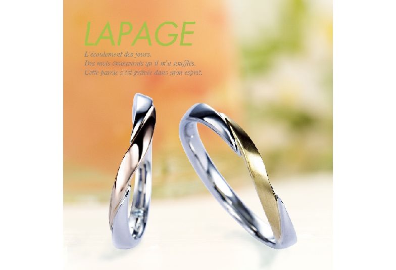 《ラパージュ》は歴史の始まり、歴史の1ページといった意味を持つフランス語、《la page》から名付けられました。ふたりにとって、ふたりだけの大きな歴史の1ページ、祝福すべき歴史の始まりです。ふたりの絆の証としての結婚指輪。これからの幸せへの歴史を刻み込んでください。そして日常の中、ふと薬指に《Lapage》の指輪を見たとき、思い出してください。『はじまりの1ページ』を…。