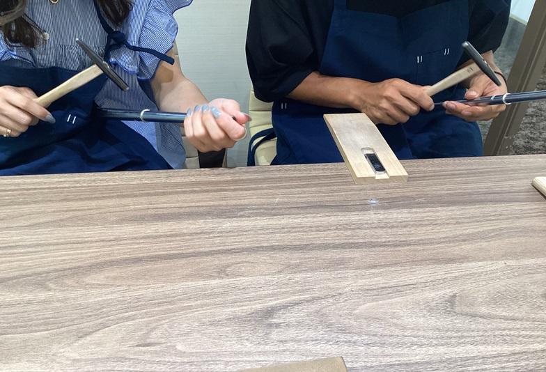 1.エプロンを着用 2.素材選び 3.幅選び 4.サイズ選び 5.工具で打っていく 6.表面の加工を専用の工具でお好みのデザインに 7.側面、表面を整える