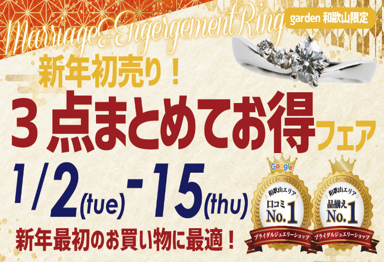【和歌山・和歌山市】新年初売り!婚約指輪&結婚指輪3点まとめてお得フェア 1/2(金)〜15(木)
