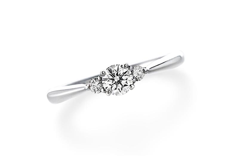 センターダイヤの両サイドに流れるようにメレダイヤモンドがあしらわれ、指元を可憐に演出してくれます。一見華やかなデザインですが、カーブデザインは女性らしい優しい印象になるため、上品に身に着けることができます。