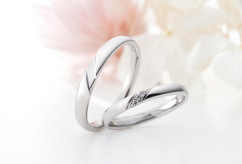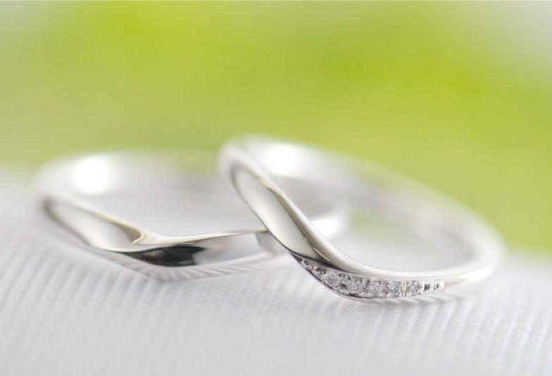 シンプルでありながらも指輪の曲線にあわせてダイヤモンドが施された結婚指輪です。このようなデザインは、曲線が手元のラインに馴染みやすく着けごこちが良いのが特徴です。指輪も細身のタイプで主張しすぎず、どのようなシーンや服装にも馴染みます。