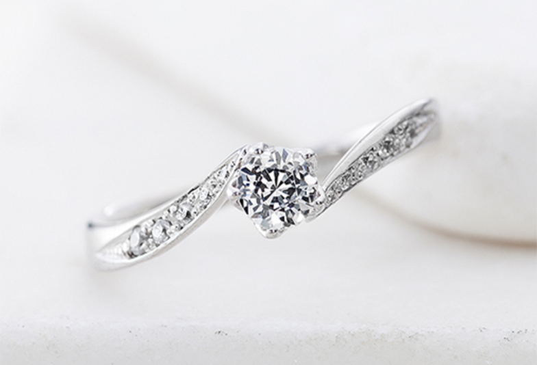 流れるようにセットされたメレダイヤモンドがエレガントな印象の婚約指輪です。丸みのある形状のリングが可愛らしさも演出。絶妙なバランスの婚約指輪デザインです。