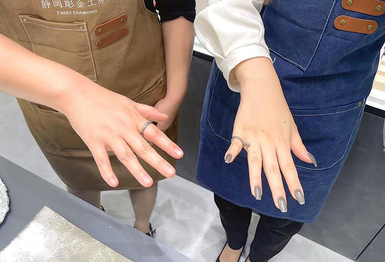 FIRST DIAMOND静岡彫金工房は、フルオーダー専門店と手作り工房がひとつになったワークショップ型ジュエリーショップです。ペアリングやバングルを手作りできるだけでなく、将来的に婚約指輪や結婚指輪も選ぶことができます。ペアリングで担当したスタッフが、プロポーズからおふたりの結婚準備までサポートするサービスも人気があります。