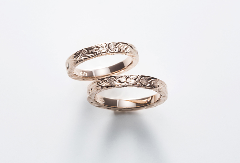 休日に身に着ける程度の方からは、ファッショナブルなデザインが人気傾向にあります。プライベートの系統にあわせてカジュアルめのデザインを選んだり、ゴールドカラーで選んだりすることで華やかさを演出することができます。MAKANAの結婚指輪は、ダイナミックな手彫りが華やかな印象を与えてくれます。