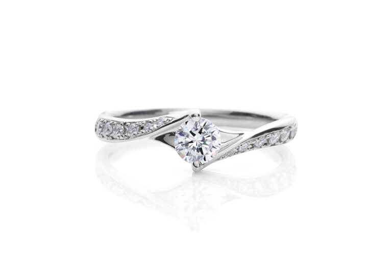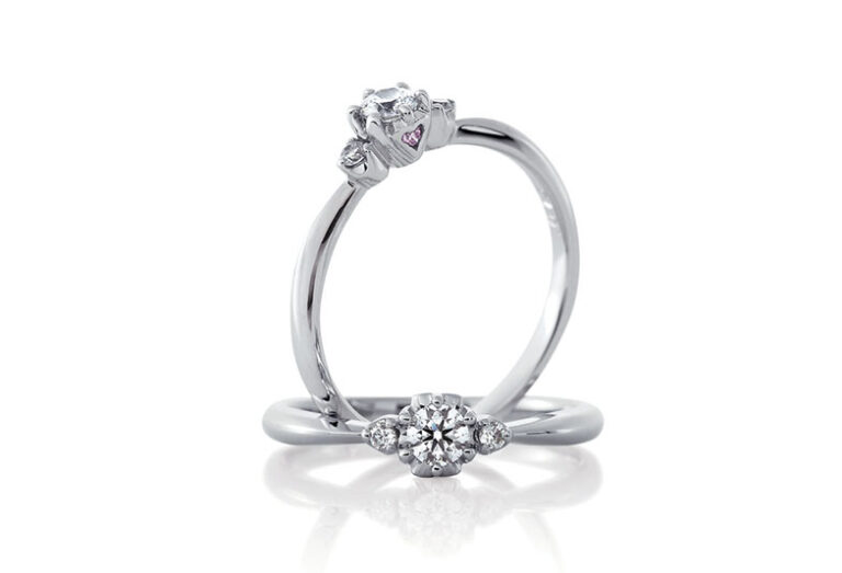 中央のダイヤモンドの両サイドにメレダイヤを添えた、上品で華やかなサイドメレタイプ。さりげないアクセントが女性らしさを引き立て、普段使いもしやすい人気デザインです。