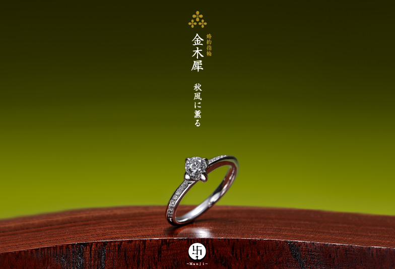 秋風に薫る金木犀の花をデザインした婚約指輪です。沢山の花を咲かせる金木犀には、繁栄の意味も持ちます。小さめのメレダイヤモンドが連なった、ゴージャスさと謙虚がうまく融合した婚約指輪に仕上がっています。