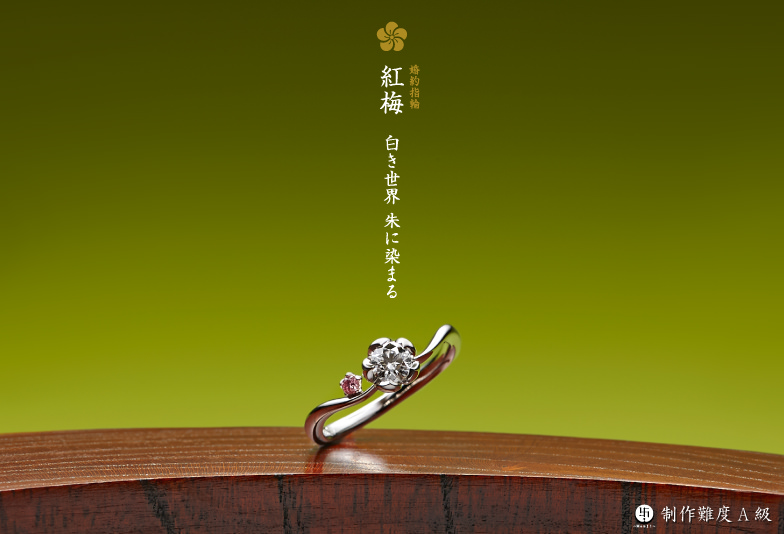 厳寒の中、春告げる梅花をデザインした婚約指輪。ぷっくりと丸い5枚の梅の花びらが、ダイヤモンドを包んだ実物に忠実なデザインです。サイドのピンクダイヤモンドを包む石枠も梅の花びらを表現し、愛らしさと可憐さを兼ね備えた婚約指輪です。