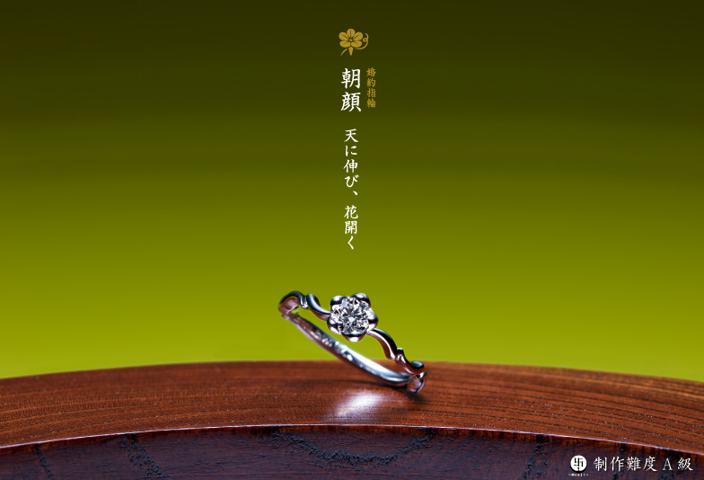 朝顔のつるとラッパ状の花弁を表現した婚約指輪です。躍動感のあるつるを模したアームデザインが指に馴染み、存在感を与えてくれます。みずみずしい花弁にも注目です。