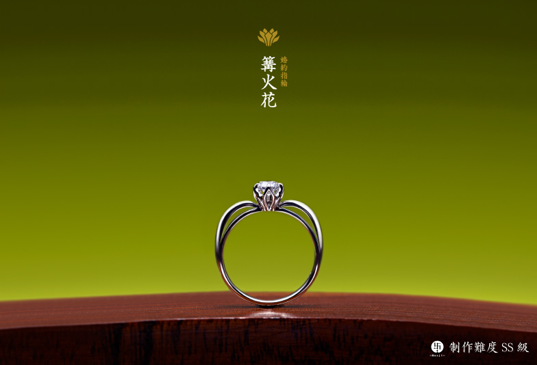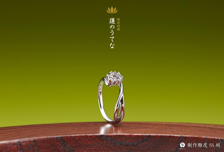 蓮のうてなとは、お釈迦様が座る台座の事を指します。12枚の蓮の花びらを二重にて顕したこだわりの婚約指輪。二つに分かれたアームは、異なる人生を歩んでいたお二人を象徴し、巡り会い、一つの道を歩み、神仏に見守られていくのです。