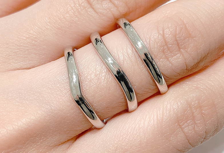 結婚指輪の形は大きく分けて【ストレート・ウェーブ・Vライン】の3つに分けられます。その中でもウェーブの形状は、水かきを結ぶラインや指の丸みに沿ってフィットするので、着け心地が良くなります。