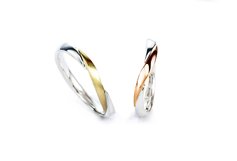 まるで2本の指輪が重なっているようなデザインの結婚指輪です。V字ラインのアームが指をスッキリと長く見せてくれます。部分的ではなくしっかりと、2つの素材を感じたい方におすすめです。