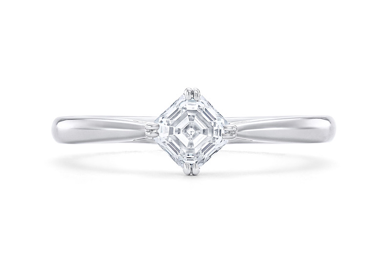 4面体という多面的な構造によって、ダイヤモンド本来の「白く透明感のある輝き」を最大限に引き出すのが特徴です。スクエアに近い八角形のフォルムと、内側から光がわき出るような澄んだ輝きを持つ、非常に特別なダイヤモンドのカット技術。