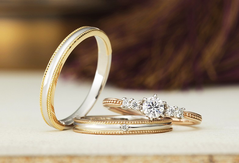婚約指輪、結婚指輪ともにミル打ちが美しく加工されたアンティーク調のオシャレなデザイン