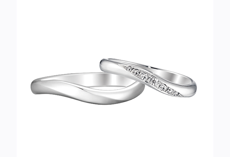 リングのウェーブラインに沿って、メレダイヤモンドがセッティングされているため、指輪を動かすたびに光が流れ、上品かつ美しい手元を演出します。men’sデザインは、石のないシンプルなデザインですが、lady’sデザインと同じく柔らかなウェーブラインを描いているため、指の付け根に沿いやすく、着け心地が非常に軽く、指が綺麗に見える効果があります。