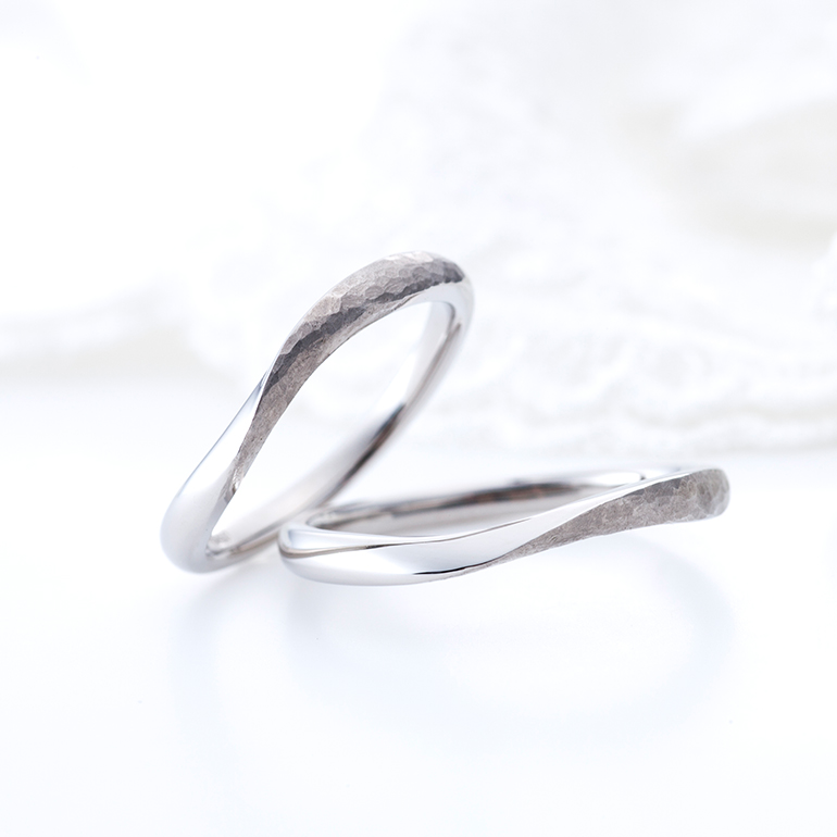 ポイントに槌目加工がされたおしゃれな結婚指輪。