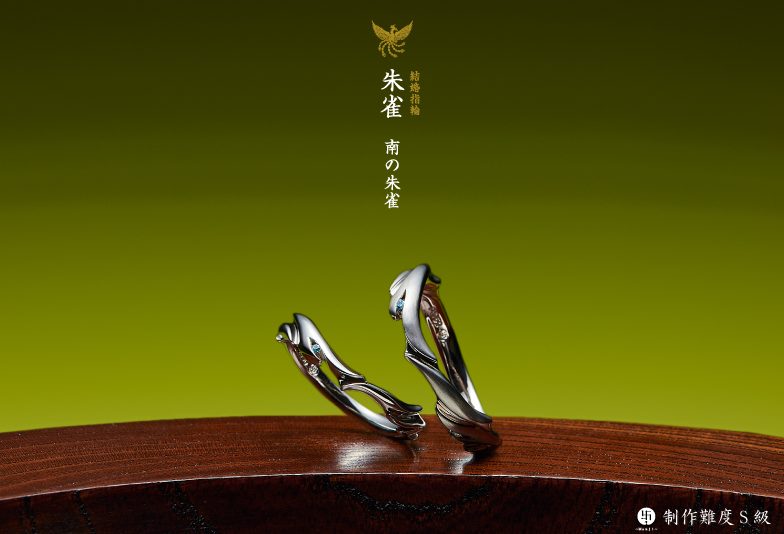 朱雀は、『火の鳥=鳳凰』をモチーフにした、非常に縁起の良い指輪とのことです。指輪全体に施された強すぎず、弱すぎない曲線が、朱雀の羽根であり、炎がゆらめきながら舞い上がる様子を表現しているそう。指輪に留められているアイスブルーダイヤモンドは、朱雀の蒼い瞳を象徴しており、特別な製法で留められているんだとか。格好いいデザインなので、男性から人気がありそうだと思いました。
