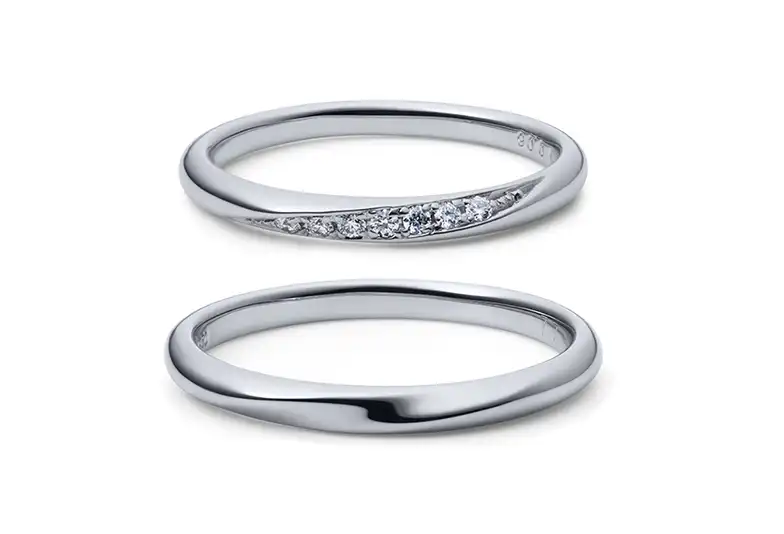 『シンプルだけど、人とは違うこだわりが欲しい』というカップルに人気のデザインです。最大の特徴は、まる空に架かる虹のように、立体的で躍動感のあるウェーブラインです。単なる平面的なカーブではなく、金属がやさしくひねりを加えられたようなフォルム。この立体感が、指先に奥行きと高級感を与えてくれます。lady’sの華やかな『虹』に対し、men’sデザインはその虹を支える『空』のような包容力のある太さ。お二人の個性を出しつつも、ペア感がしっかり感じられるデザインです。