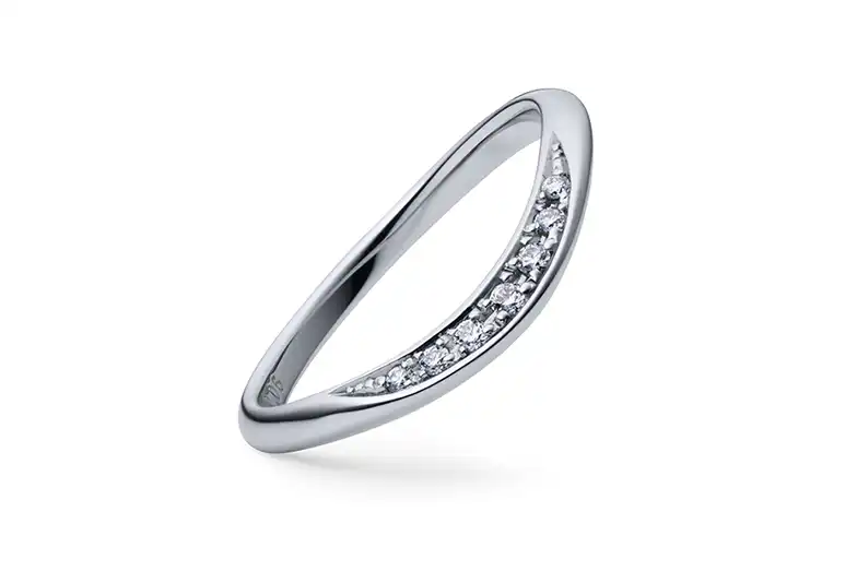 lady’sデザインには、大きさの異なる7石のメレダイヤモンドがセットされています。ベースはシンプルなストレートラインに近いですが、ダイヤモンドのセッティングやラインの削り出しによって、指を美しく見せるウェーブの視覚効果を併せ持っています。華やかさはありつつも、派手すぎない絶妙なバランス。お仕事などの普段使いでも違和感なく着用できる『上品な華やかさ』が人気の理由の一つです。