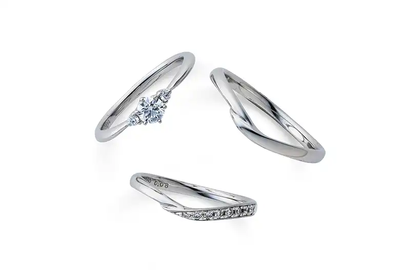 『薬指に舞い降りた流れ星』をイメージしており、手元を動かすたびにさりげなく光を放ちます。緩やかなV字に近いウェーブラインが特徴です。lady’sデザインには、ダイヤモンドのセッティングされていますが、その石座が『星の形』をしています。5点留めのスターセッティングにより、小さなダイヤモンドでも星が輝いているような存在感が楽しめます。手を握った時の違和感が少なく、普段指輪を着け慣れない男性からも支持されています。
