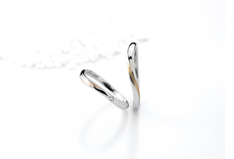 緩やかなウェーブラインの結婚指輪。側面から見ると波のような特徴的なデザインです。角度によって見えるゴールドの色味がとてもオシャレ!