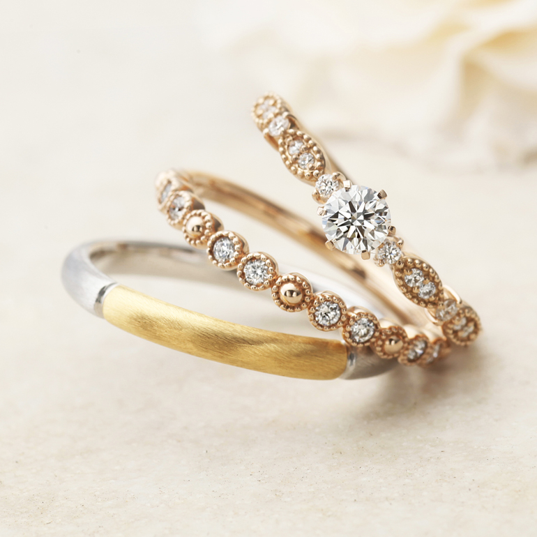 ダイヤが2石ゴールドの玉ぐりが1つと配列されお二人の未来を明るく照らす太陽のよう。細身のストレートタイプでエンゲージとの重ね着けにもぴったり。肌馴染みの良いゴールドのお色味と、ツヤ消しの柔らかな風合いが印象的なセットリング。