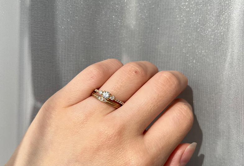 婚約指輪と結婚指輪をゴールドで揃えることで、統一感のある上品なコーディネートに。結婚指輪をシンプルにすれば、婚約指輪の華やかさがより引き立ちます。