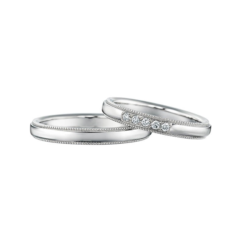 熟練した職人が手打ちしたミルグレインが美しいクラシカルなリング。両サイドに1周手打ちされたミルグレインは、さりげなく上品な輝きを演出してくれます。