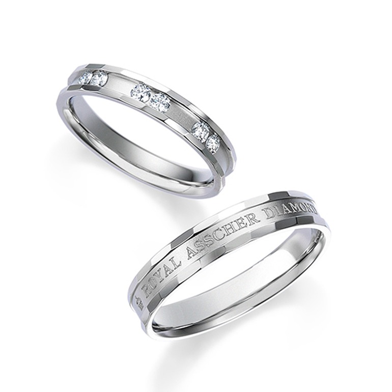 世界的に知られるダイヤモンドブランド「ROYAL ASSCHER(ロイヤルアッシャー)」の結婚指輪は、ブランドのロゴが刻まれたスタイリッシュなデザインが特徴です。ブランド好きの男性から特に人気が高く、シンプルでありながら存在感のある一本に仕上がっています。プラチナの輝きが上品で、ふたりの手元をエレガントに彩ってくれるんです。