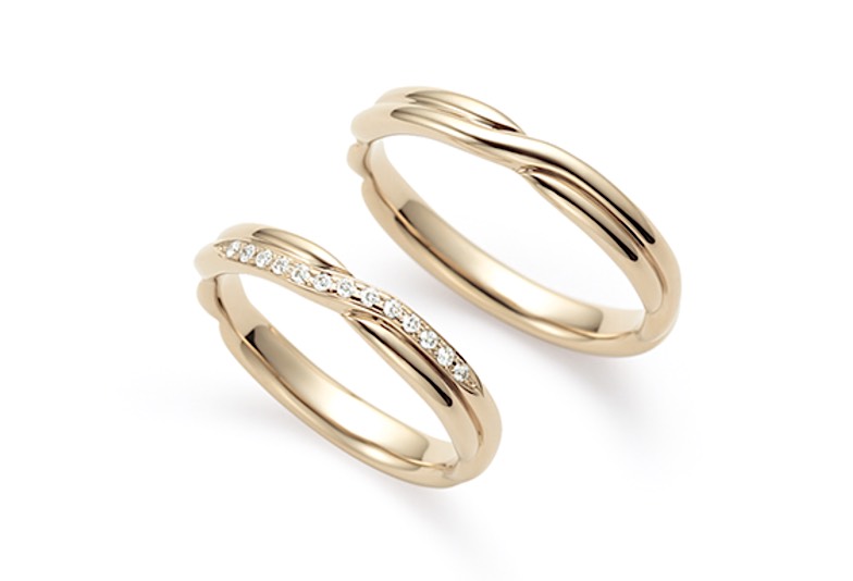 「縁~えにし~」は、2本の紐をイメージし、リング全体で固く結ばれたふたりの縁を表現しています。中央で2本の紐がクロスしたような個性的なラインと、ボリューム感のある華やかな輝きが他にはないデザインの結婚指輪です。素材をプラチナ、イエローゴールド、ピンクゴールドへ変更したり、ブランドオリジナルの蜂蜜のように淡い「ハニーイエローゴールド」を選ぶこともでき、よりふたりらしい結婚指輪にすることができるのも魅力です。