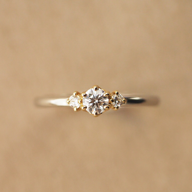真っ直ぐ並んだ3つのダイヤモンドはシンプルながらも存在感たっぷり。サイドのダイヤを少し大きめにすると、ボリューム感が増して華やかさもぐんとアップするんです。手元を動かすたびにキラッと輝いて、気分まで晴れやかになりそうですよ。