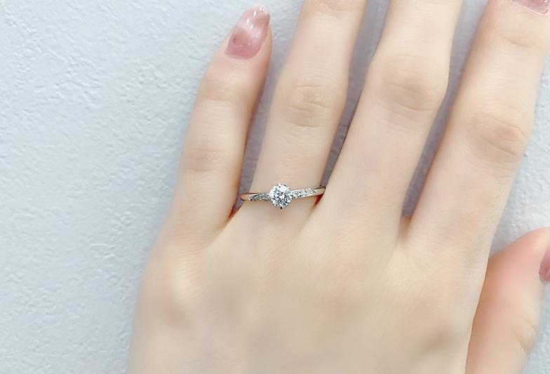 メレダイヤモンドが流れるようにアームに散りばめられた、華やかな婚約指輪。斜めにセッティングをすることで、上品な雰囲気を与えるとともに、指をすっきりと見せてくれます。