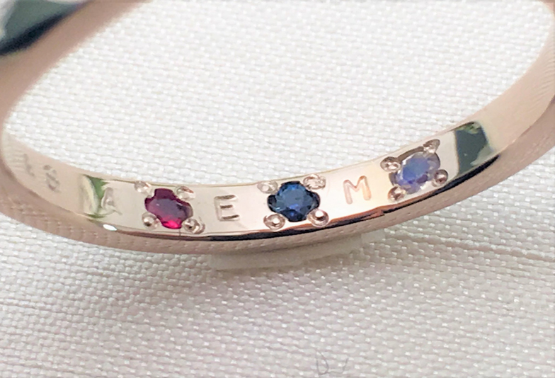 リング内側にお子様の生まれた誕生石をお名前のイニシャルと一緒に追加工。