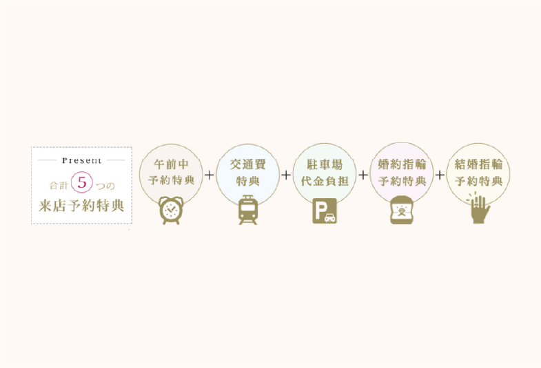 LUCIR-K BRIDAL浜松では、ホームページからの来店予約で最大5つの特典がプレゼントされます。さらに、10:30~12:00の間に予約をすると、お見積もりから5%OFFなどの特典があり、婚約指輪や結婚指輪をお得に選べるため、お店へ訪れる際はHP予約がおすすめです。