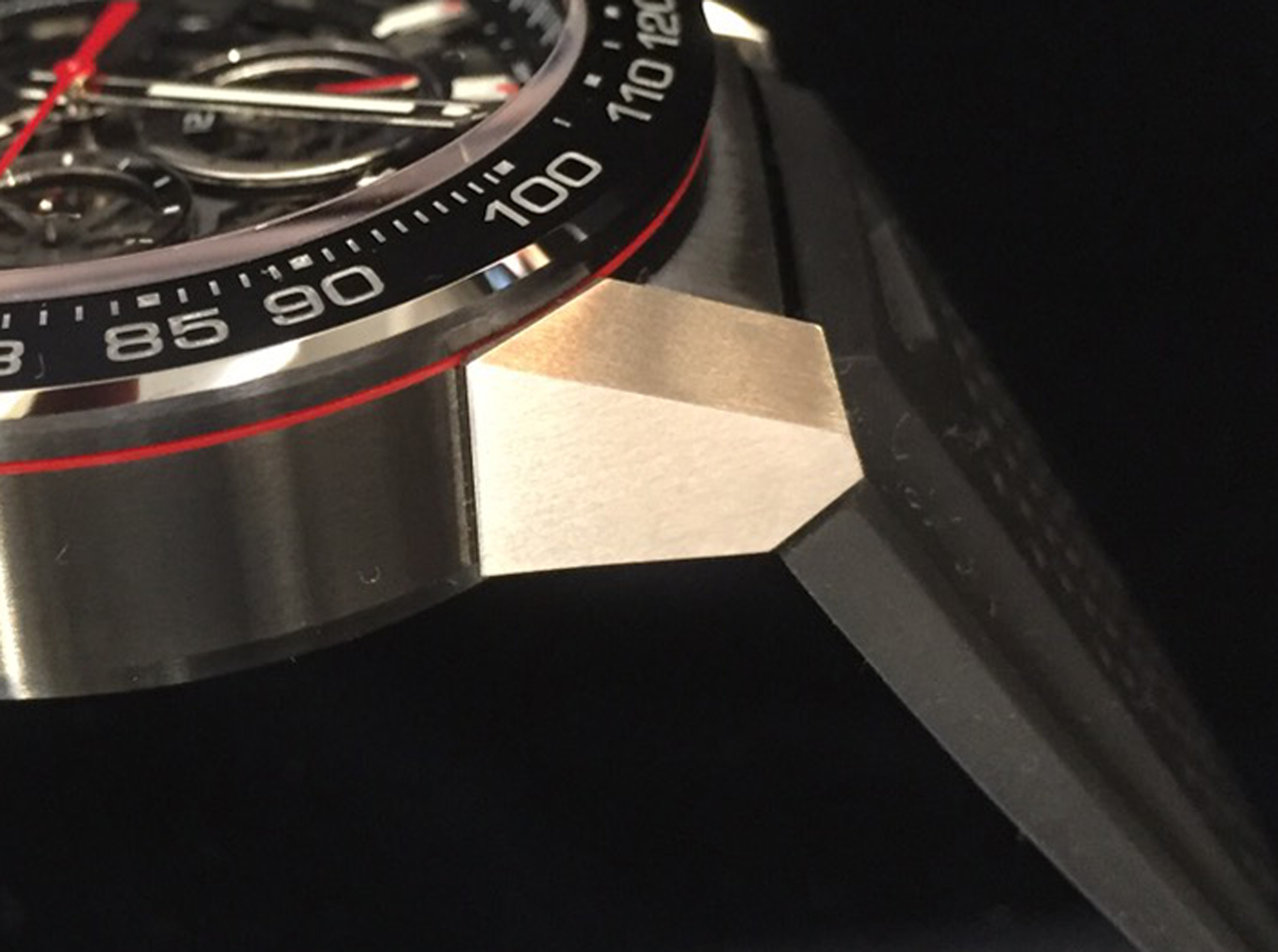 サテン仕上げの炭化チタニウムコーティング(黒い部分)とポリッシュとサテン仕上げのラグにレッドのラインがインパクト抜群です。