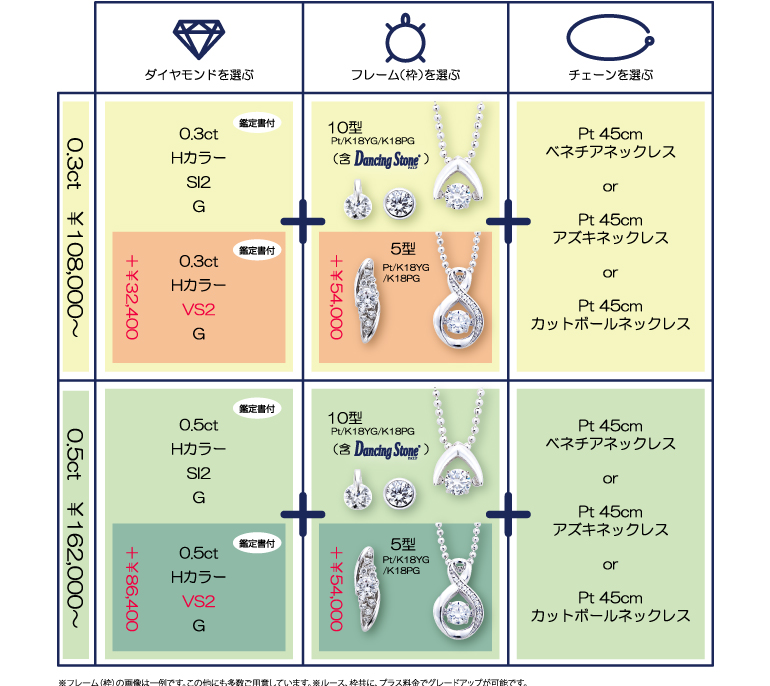 0.3ctの良質ダイヤモンドをお好きなフレーム(枠)とチェーンでセミオーダーして、なんと108,000円~!