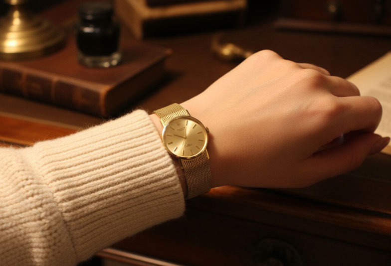 素材の統一感: 時計のケースがゴールドであれば、重ね付けするアクセサリーもゴールドで統一させると、まとまりが生まれ、洗練された印象になります。