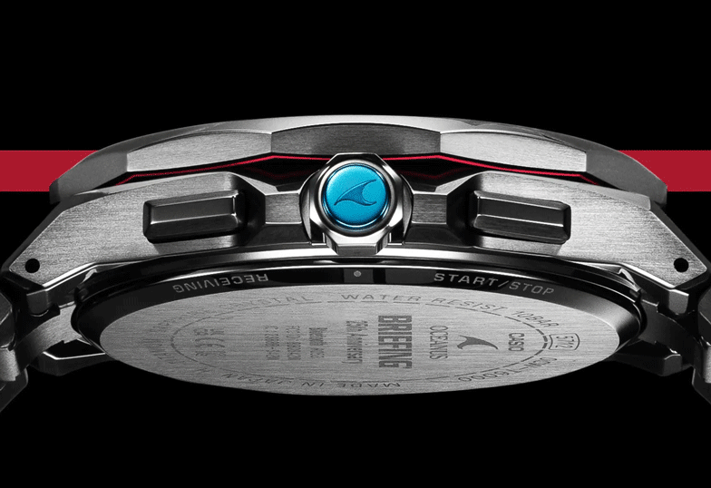 ベゼル下部にBRIEFINGの象徴であるレッドライン、りゅうずにオシアナスブルー、サイドビューにのみアクセントカラーを配色することで、「DELTA」シリーズと同様、オールブラックの印象を損なうことなく、ブランドイメージをさりげなく主張してます。