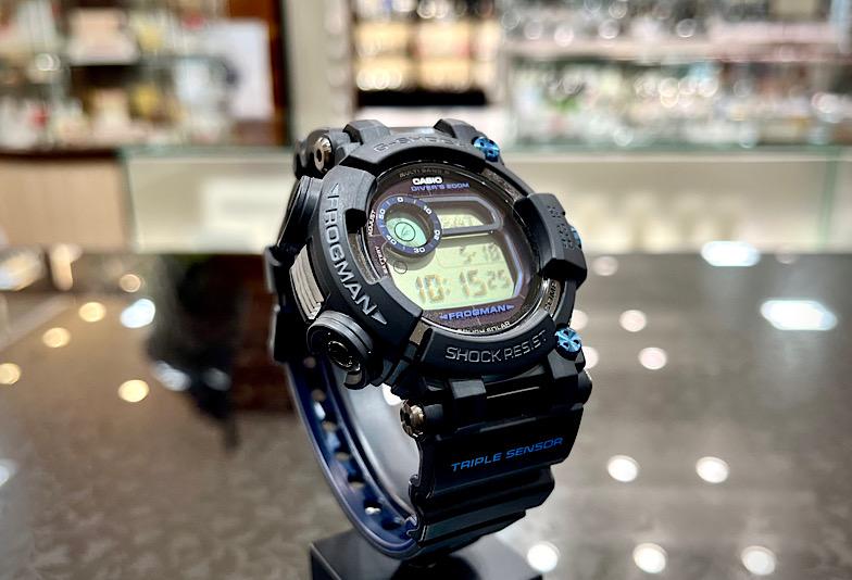 ジーショックなのにダイバーウォッチ?スイスの名だたるダイバーウォッチが有名になる中で、ブームを巻き起こしたダイバーウォッチが日本にも存在していたのをご存じの方は少ないかもしれません。ジーショックと言えば落としても壊れない時計、水にも強い時計というイメージが一般的。いまやジーショックは日本が世界に誇るデジタルウォッチとして、多彩な機能やシリーズを抱えています。今回紹介するジーショックフロッグマン。実は30年以上もの歴史をもつロングセラーのシリーズです。ステンレスではなくカーボンを用いて200メートル防水を実現。カーボンは炭素でできている素材ですが、実は宇宙船にも使われているほど強固な素材。独自のカーボンコアガード構造で高い水圧にも耐えうる気密性を実現。ジーショックならではの耐衝撃性に加えて、潜水できるほどの防水性。一般人だけではなく、プロの冒険家にも愛される逸品として高い支持を得ています。その人気ぶりは新製品や限定色の予約が全くできないほど。一見アンバランスにも見えるような、左側に張り出したデザインも他のジーショックのシリーズにはないタフさを感じます。高さや大きさもしっかりとしており、ダイバーウォッチの中ではダントツのボリューム感。またジーショックらしく、水深や温度、方位などが計測できるのも多機能で便利。大きく無骨なのとは裏腹に繊細なカラーリングと、裏蓋のチャーミングなカエルのマークが魅力です。