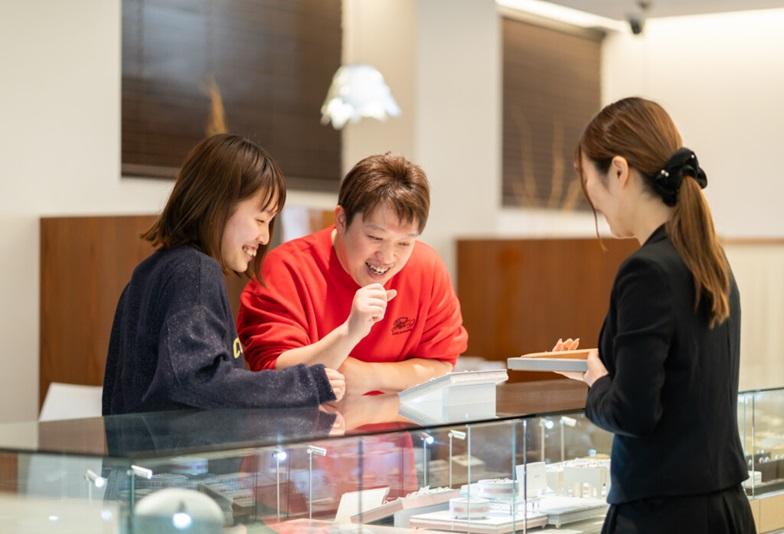 【Kさん】 僕は指輪を選ぶこと自体が初めてでしたが、1日でこんなに多くの指輪を見ることに驚きました。まず、予算をスタッフの方にお伝えし、その予算に合う指輪を紹介してもらったのですがほとんどのショーケースを開けて試着させてもらったのではないかと思います。